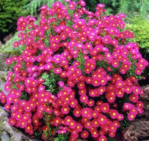Астра новобельгийская Red — компактный многолетник с насыщенно-красными соцветиями и жёлтой серединкой. Цветение длится с конца августа до октября, придавая саду выразительность до первых заморозков. Морозостойкий и неприхотливый вид подходит для бордюров, миксбордеров, рокариев и групповых посадок.