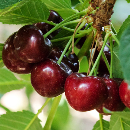 Саженец вишни «Кирина» — компактное среднерослое дерево с аккуратной шаровидной кроной. Плоды тёмно‑красные, плоскоокруглые, весом 4,5–5,0 г, плотностью средней степени, сочные с выраженным кисло‑сладким вкусом. Плодоножка отделяется «насухо», что упрощает сбор урожая. Сорт среднеранний, универсального назначения — для свежего потребления и переработки. Урожайность регулярная и высокая после входа в плодоношение.